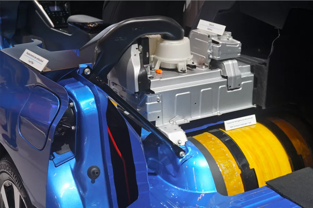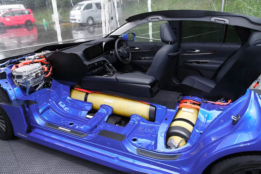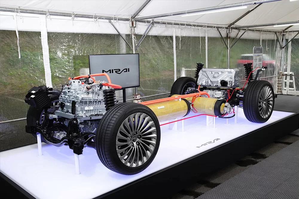 Por otra parte los vehículos eléctricos híbridos (HEV), eléctricos híbridos Plug-In (PHEV), eléctricos a batería (BEV) y eléctricos de celdas de combustible (FCEV) son las cuatro tecnologías fundamentales que Toyota ofrece a sus clientes. Y por ello su apuesta por la diversidad tecnológica para alcanzar la neutralidad de carbono. Por consiguiente los FCEV son vehículos eléctricos, el hidrógeno y el oxígeno son los componentes que impulsan el motor eléctrico de los vehículos. Cuya membrana de intercambio de protones (PEM) permite la liberación de energía eléctrica.