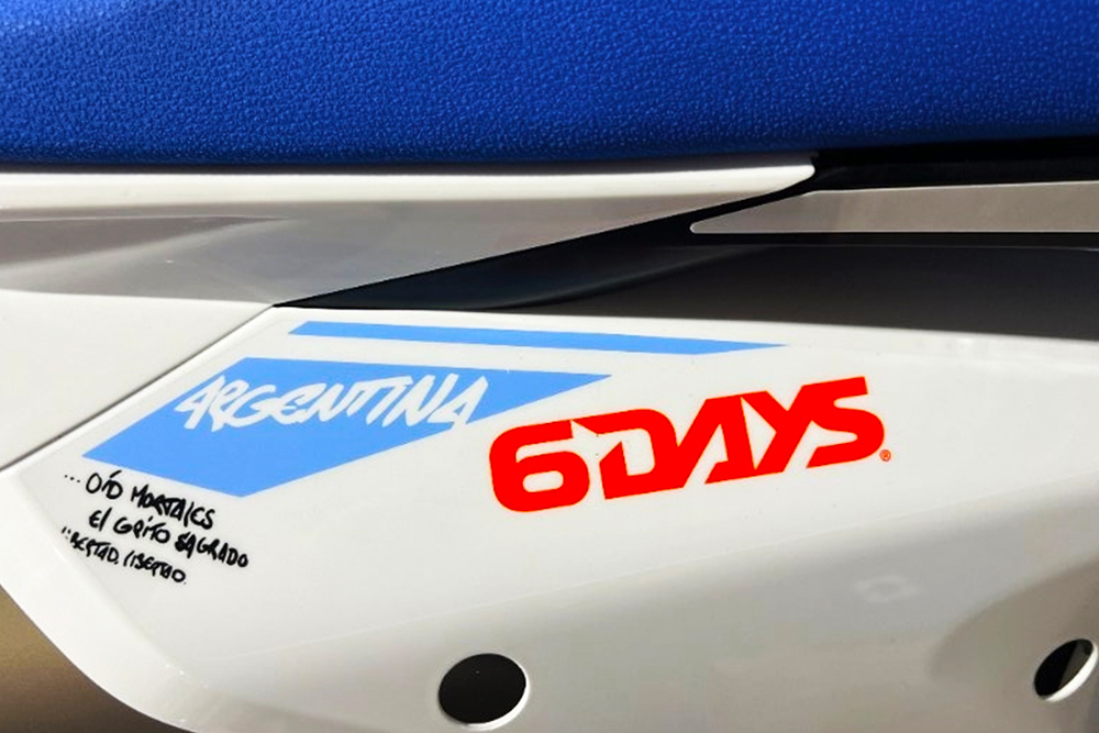 La versión 2024 de la KTM 350 EXC-F SIX DAYS no solo ofrece un rendimiento excepcional, sino que también celebra la identidad argentina. Detalles gráficos como estrofas del Himno Nacional, las Islas Malvinas, el mate, la Ruta 40, y el número 47 de Kevin Benavides, campeón del Dakar 2023, se integran en el diseño. Además, la moto incluye accesorios exclusivos como el asiento SIX DAYS, manillar específico, silenciador antracita con logo SIX DAYS, y otros elementos distintivos.