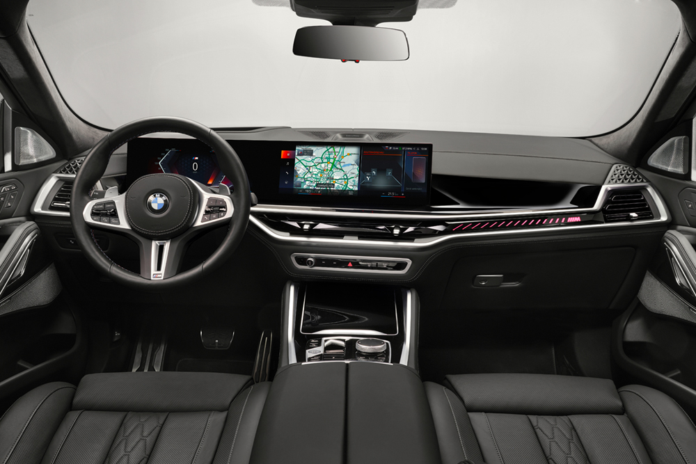 El diseño de la BMW X6 incluye faros delgados, parrilla iluminada BMW Iconic Glow y detalles aerodinámicos del paquete M Sport. Las llantas M de 20 pulgadas y la caída distintiva del techo resaltan su perfil dinámico. Su suspensión neumática permite ajustar la altura del vehículo según el terreno.