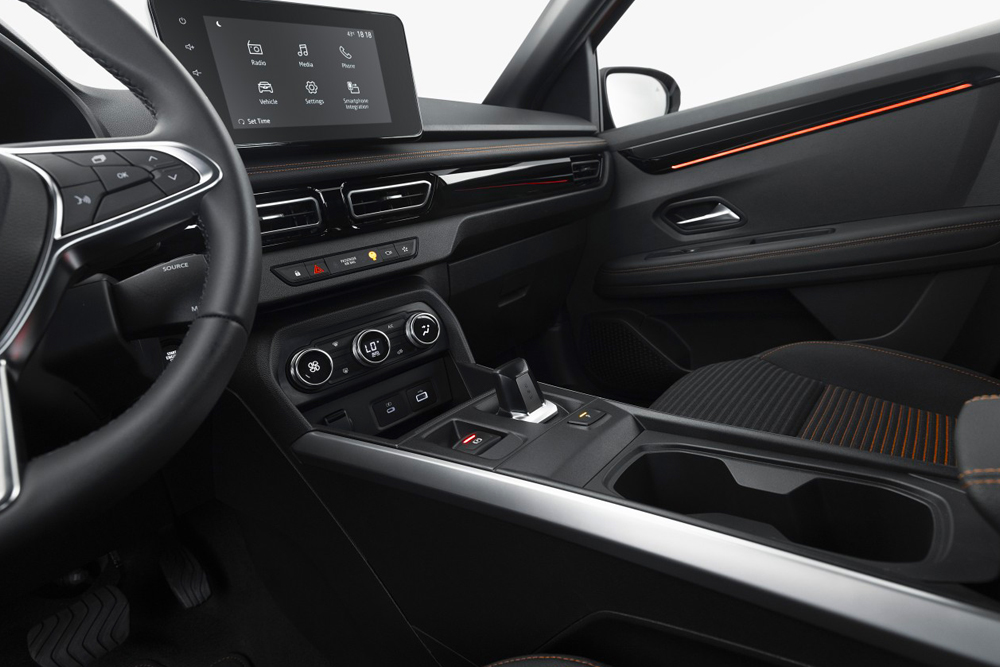 El interior combina confort y funcionalidad con una consola central de 8 litros de capacidad y puertos USB disponibles en todas las versiones. La pantalla multimedia de 8” es compatible con Android Auto y Apple CarPlay, y ofrece tres modos de conducción: Eco, Sport y MySense.