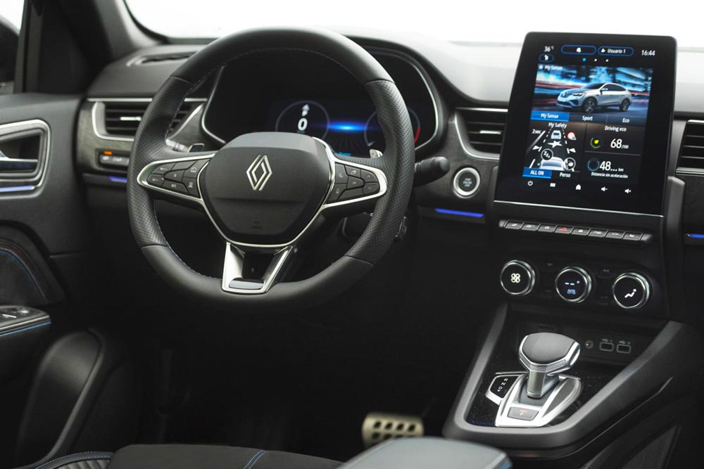 En cuanto a confort, el Arkana cuenta con climatizador automático, cargador inalámbrico, volante calefaccionado y asientos delanteros eléctricos con memoria.