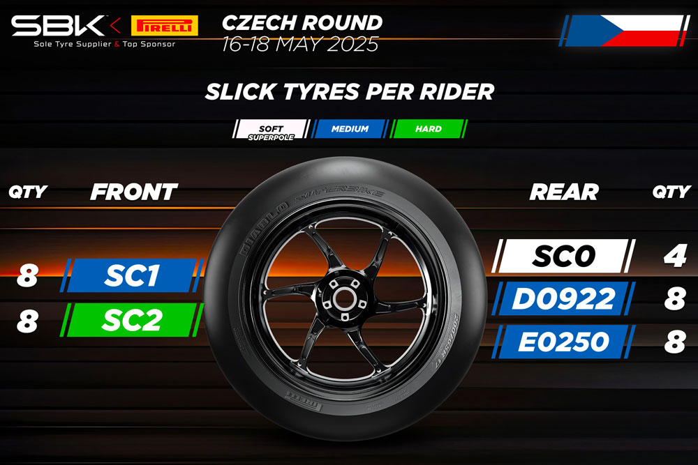 En la quinta fecha del FIM Superbike World Championship en Most (República Checa), Pirelli lanzó el neumático trasero E0250 en compuesto medium, junto a la solución D0922 —ya probada en Phillip Island—. Ambas opciones buscan optimizar el rendimiento en un circuito conocido por su alto desgaste. El SC0 estándar se reservará para prácticas y la Superpole Race.