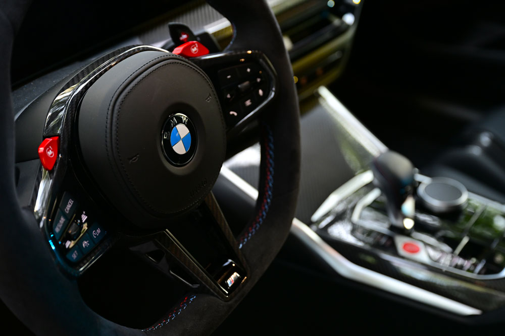 Interior con volante M en alcántara, butacas deportivas en carbono y pantallas curvas (12.3″ + 14.9″)