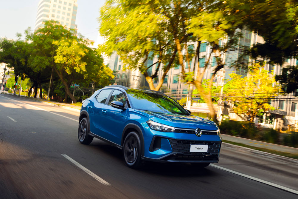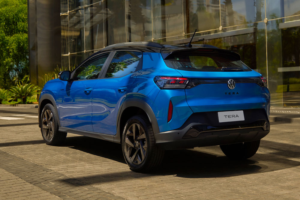 Desarrollado bajo la plataforma MQB, el Tera destaca por sus líneas dinámicas y proporciones equilibradas. La firma lumínica VW LED y los faros traseros con efecto «click-clack» refuerzan su identidad. Además, incluye «Easter Eggs» (detalles ocultos) como guiños a modelos emblemáticos como el Beetle y el Gol.