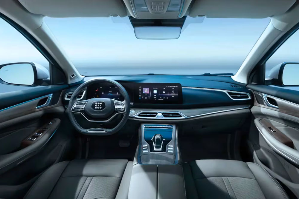 El interior está organizado en tres filas con capacidad para siete personas. Incluye una pantalla digital de 7 pulgadas en el tablero y un sistema multimedia central de 12,3 pulgadas con GPS, conexión 4G, y compatibilidad con Android Auto y Apple CarPlay de forma inalámbrica.