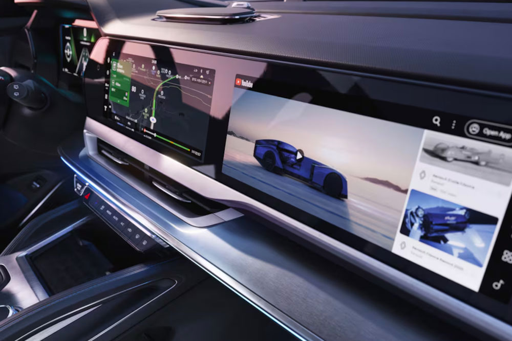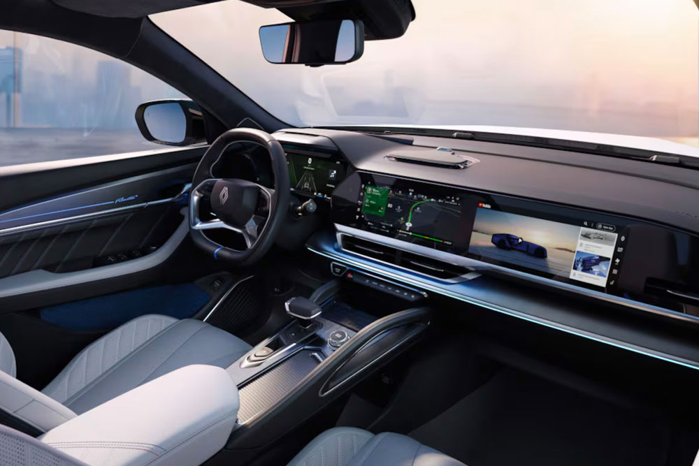 El interior prioriza la experiencia digital mediante un panel horizontal con tres pantallas de 12,3 pulgadas. Este sistema gestiona la instrumentación, el entretenimiento y funciones para el acompañante. Se complementa con un head-up display de realidad aumentada de 25,6 pulgadas.