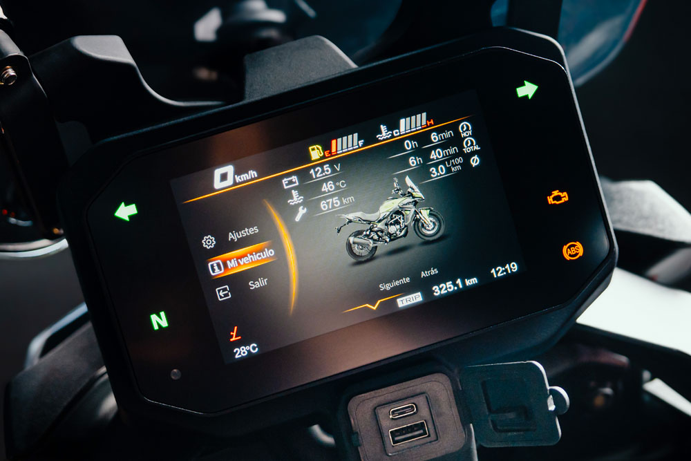 En el tablero, un display TFT a color de 5 pulgadas muestra toda la información de la moto. Este sistema se conecta vía Bluetooth al teléfono para ver llamadas y notificaciones. Para mantener los dispositivos cargados, incluye puertos USB tipo A y tipo C.