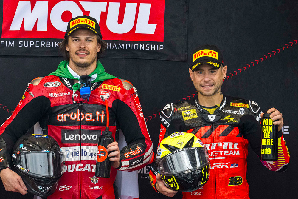 Ese sábado, el podio fue un verdadero desfile de la Panigale V4R. Detrás de Bulega se ubicaron Yari Montella (Barni Racing Team) y Lorenzo Baldassarri (Team GoEleven), completando un 1-2-3 para el modelo italiano.